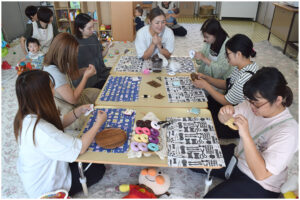 ママ達は、フェルトのフチを縫って綿を詰め、作業に集中してリフレッシュ。