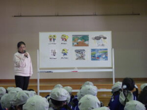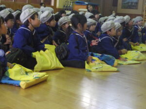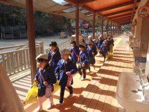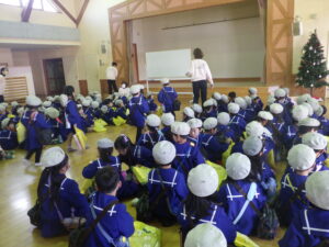 12月19日に防災訓練を行いました。今月は水害の影響で崖崩れが起きたことを想定し、避難しました。放送をしっかり聞き、速やかに帰る支度をし避難することができました。水害が起きたらどういう所へ避難するのか、約束事を先生と一緒に確認しました。今年最後の避難訓練も無事に終えることができました。来年も色々な災害を想定しながら、しっかり訓練に取り組んでいきたいと思います。
