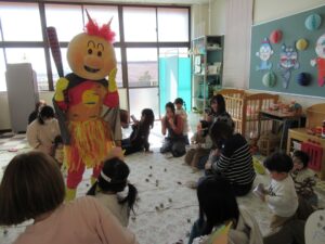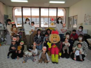 2月3日(火)、「アンパンマンと豆まき会」を行いました。絵本の読み聞かせに夢中になっていると、窓の外からアンパンマンがやってきました!皆で豆まきをして、最後には仲良く写真撮影をしましたよ(^^)