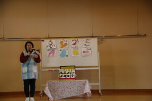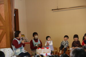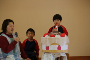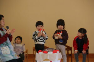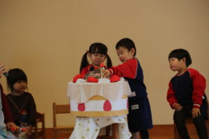 2月19日に2月生まれの誕生会がありました。自分の名前や好きな食べ物などのインタビューに答えることができました。職員からの出し物は、ひな祭りに関するものから始まるしりとりでした。大きいクラスから小さいクラスまで盛り上がりました。
