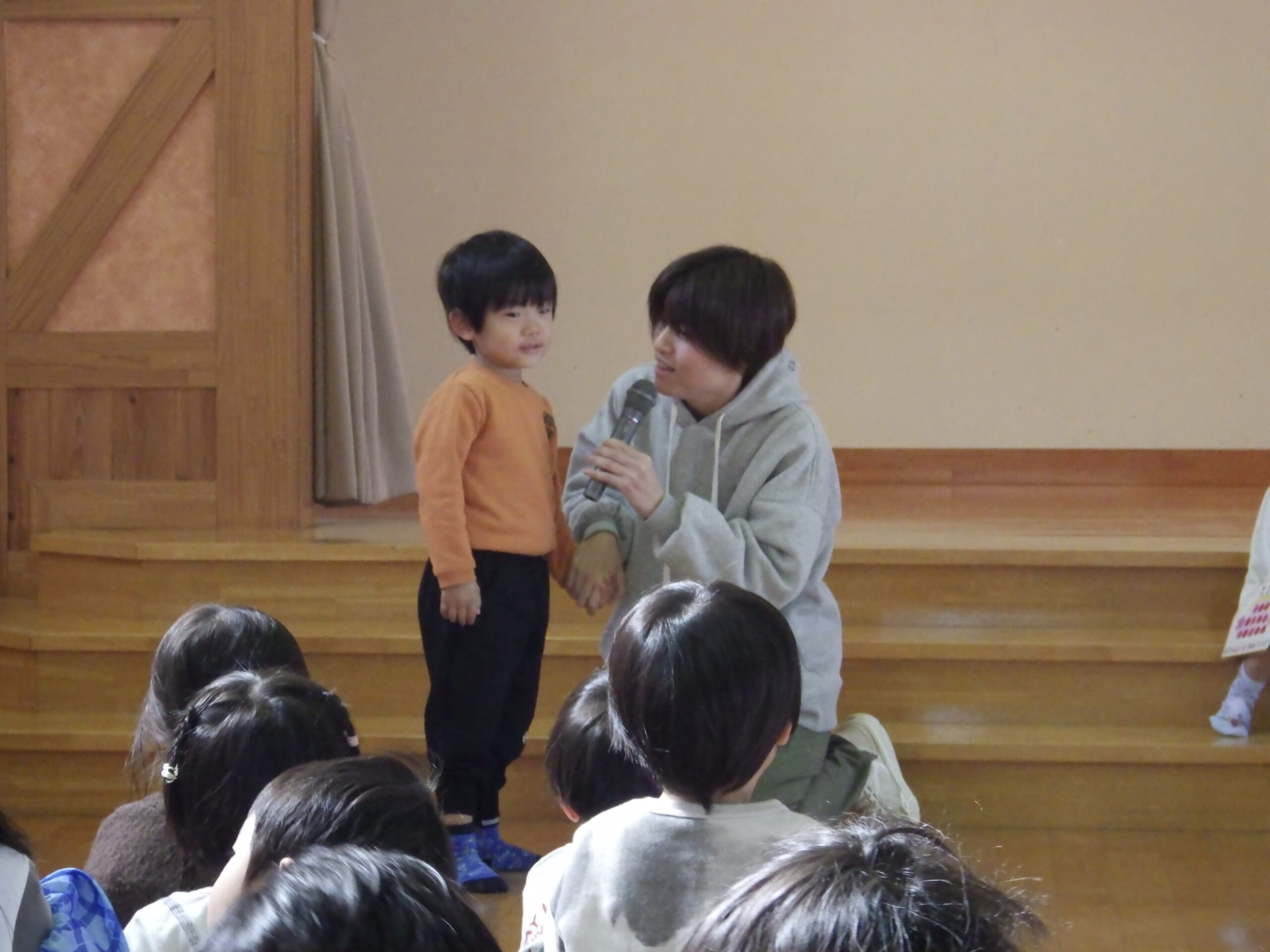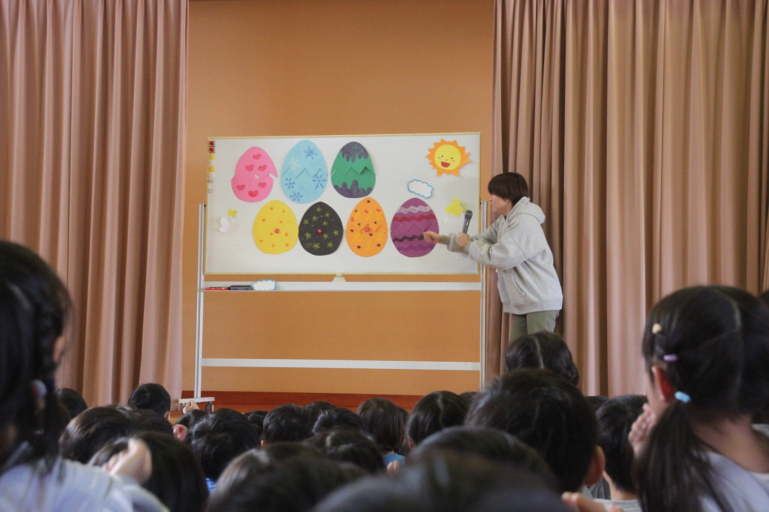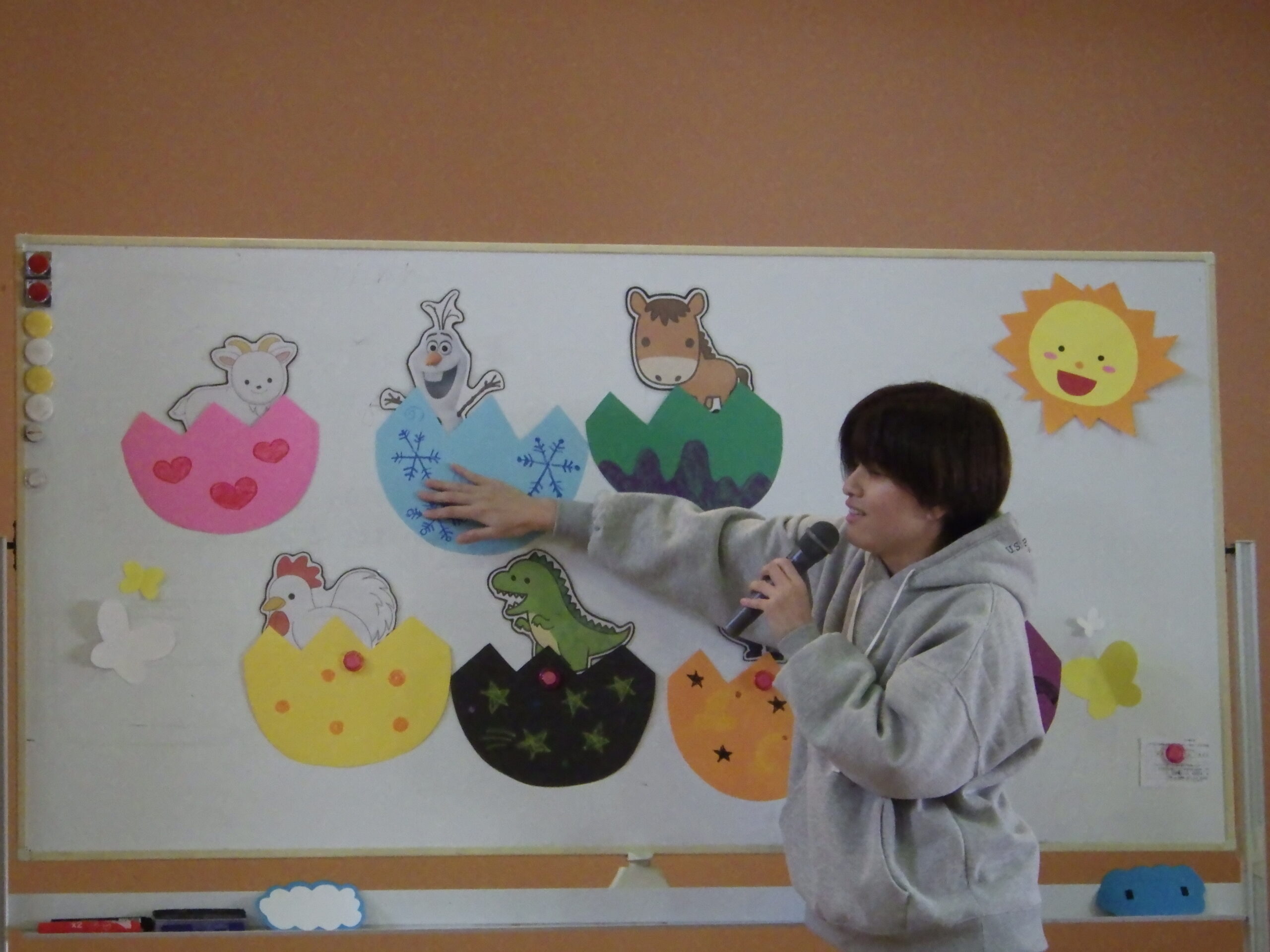 お楽しみ会では「卵の中には?」のホワイトボードシアターがありました。
